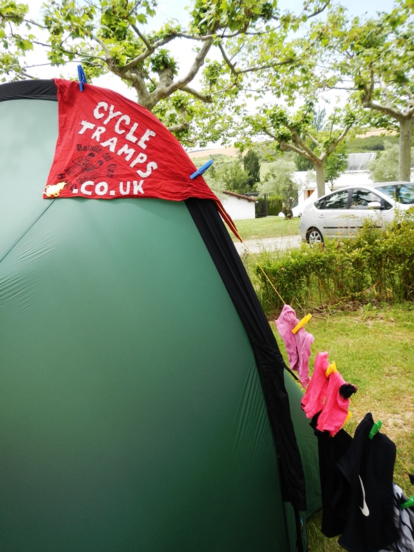 Whilst the rest of the campsite was gearing up for the running of the bulls fiesta in 6 days, setting up marquees, beer tents and stages, we caught up with our chores (mostly washing our smelly pants), I made a cycle tramps flag for the tent out of an old red wine stained t-shirt and neckerchief from the wine battle, we made friends with the campsite cat and had a takeaway pizza in our tent. We knew how to party in Pamplona.
