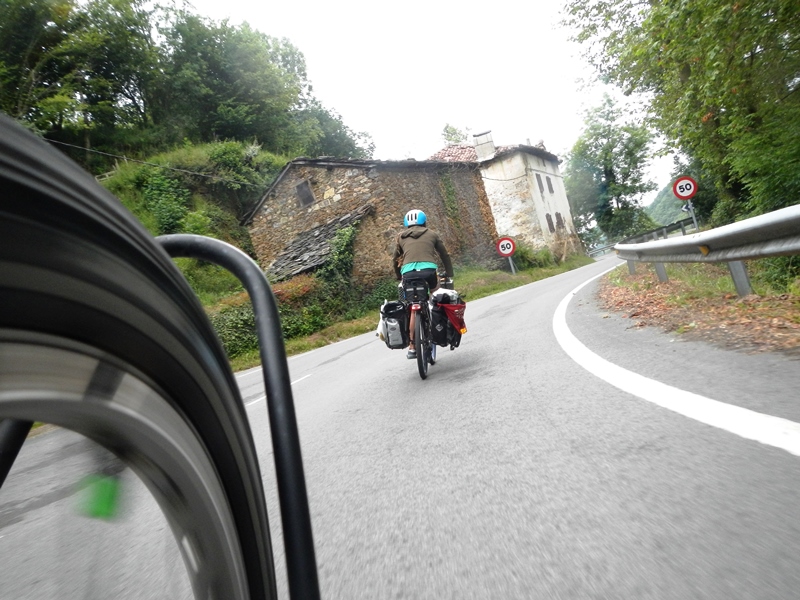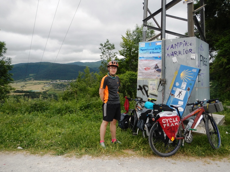 After a fairly brief decent we plodded onwards and upwards, making our way up another beautiful mountain. At the top of mountain no 2, one of the pilgrims took our picture and gestured at us in German that we were doing a good job. Well, that seemed to be the gist of what he was saying anyway. We also had a slight mechanical glitch: a dodgy link in Nev’s chain that he spotted and fixed before it did any major damage.
