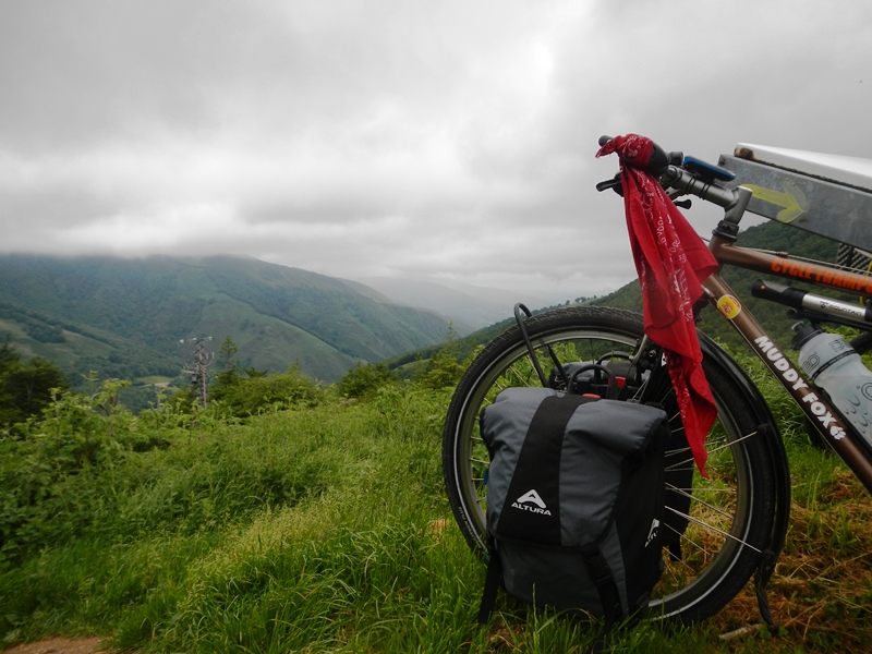 At the top, there was a little van-cafe where we stopped for a drink. They had a box on the floor for people to leave heavy clothes and unwanted items that was full of jeans and jumpers discarded by weary hikers. As weighty as our bikes were, we weren’t at the point of ditching our belongings just yet.