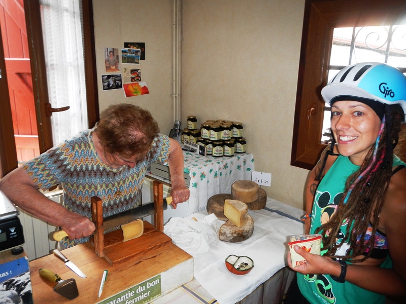 As we confusedly rolled up, a man came out to greet us and Neola tried her best in broken French to convey that we wanted to buy some cheese to go with our baguette. After listening intently and with perfect comic timing the man said, in very good English, “Would you like to buy some cheese?”. He invited us into his house to his cheese room where the man’s wife was sat waiting with some cheese and a big cheese knife.