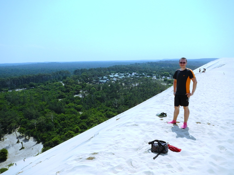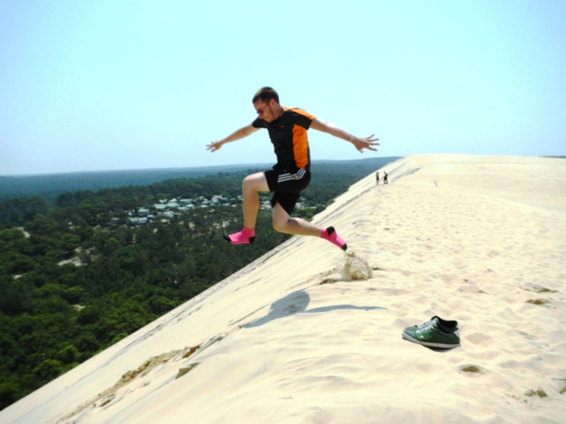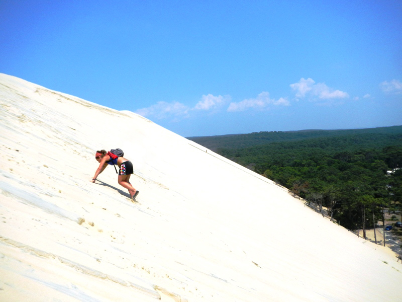 The dune was absolutely MASSIVE!! 110 meters high, towering above the tall trees in the woods. We started making our way up the bank of sand and immediately realised we were completely unprepared for the mammoth climb to the top! Imagine climbing an almost vertical wall of sand that creates an avalanche of insanely hot sand every time you put your foot down, burning your feet if you stand still too long. Ouch. If you’re reading this post and thinking about going to the Dunes de Pyla, I’d recommend a pair of ankle socks and some hiking sticks!