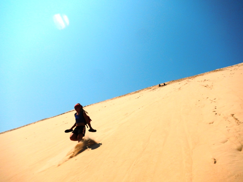 Encouragingly, there were loads of other people already at the top and making their way back down in increasingly imaginative ways: running, rolling, jumping, sandboarding! We even saw a group of German people pulling their friends down the dune on a massive piece of tarpaulin!