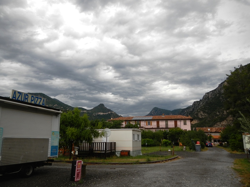 Despite our relatively short 40-mile day from Carros (through Nice and Monaco to Menton) not necessitating an early start, we were both wide awake by 6:45am. Rain had started to fall about half 6 and we’d both drifted back off but now it was more than rain. Now it was fast, heavy rain accompanied by lightning and thunder.