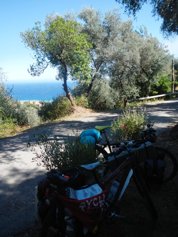 Our first impression of Monaco was that it was very hilly and insanely crowded with tourists- so many that we found it rather difficult to get anywhere with our fully laden donkey-bikes. We decided not to hang around and cracked on back into France to our campsite for the next 2 days in Menton which is, as far as I can see, the last town in France before everything goes Italian. As we entered Menton, with the GPS saying 1.5 miles to go, we were totally unprepared for the insanely steep climb up a hillside to our campsite. After climbing nearly 600ft in less than a mile we arrived.