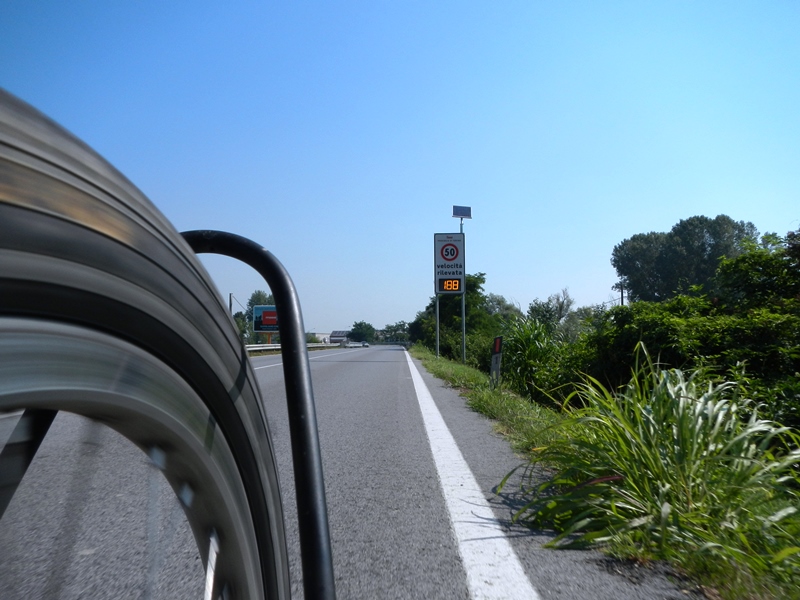 The day’s cycling had been nearly entirely flat from Cuneo, with the GPS reading that we’d only ascended 20ft in 40 miles. We even managed to reach 188 km/h (115mph) according to this sign, although I think it was broken.