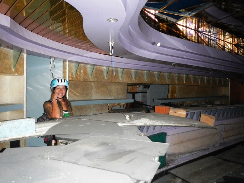 We decided to stop for lunch (today’s delicacy was beans and hot dog sausages on toast) in the shelter of an abandoned nightclub. We had a quick look inside after lunch. It was pretty cool; all gold mirrors and retro looking curved bars. Completely trashed though!